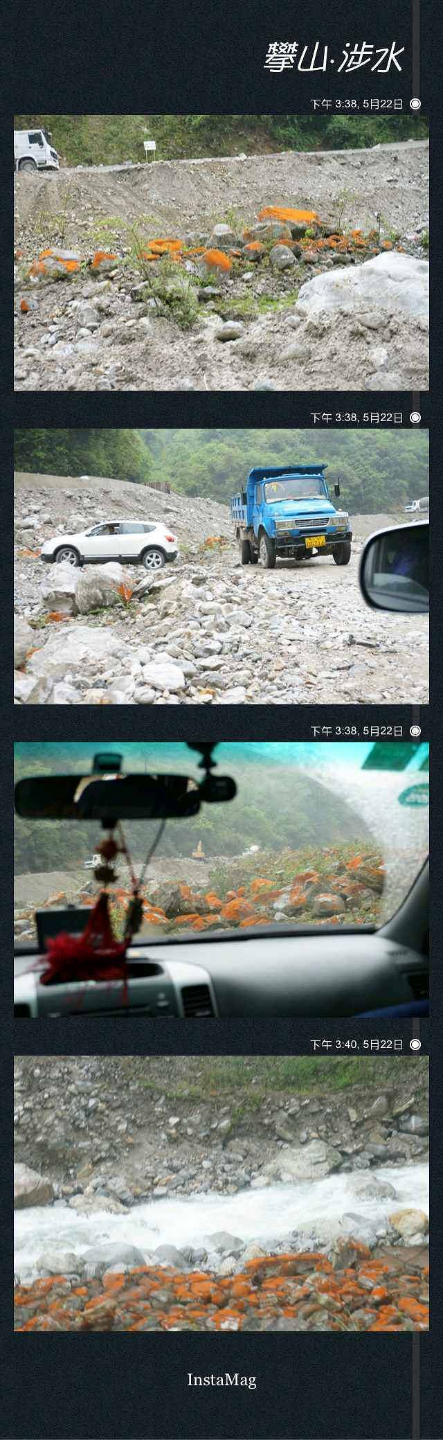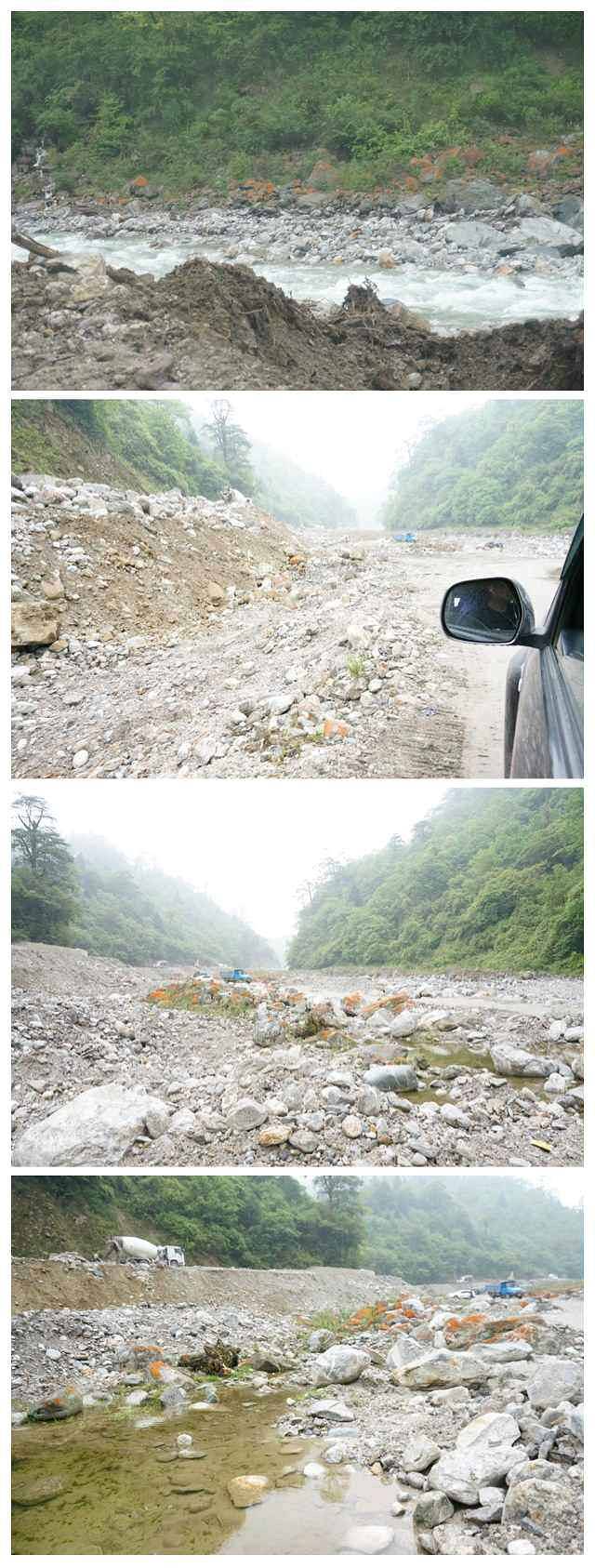 你们都说要实况,那就来一个攀山涉水的实况。离开海螺沟,从红石滩的路前往新都桥,才刚开进路上,修路的师傅说不能走这里,前面修路都挖开了。问他要走哪儿,他指了指路边下的石堆小河,纳尼?!走河里?!不能掉头的烂路,只能后车,后车30米左右,发现修路工人凿开了一条泥泞的小道,刚好够一台车过。来下去的感觉,妙不可言,拿着小奶油一路抓拍,一边感受石堆路带来的颠簸,从中感受平衡飞快的拍下照片记录这一切,晃荡一下,一个大坑让我再次感受搓板路的美妙。