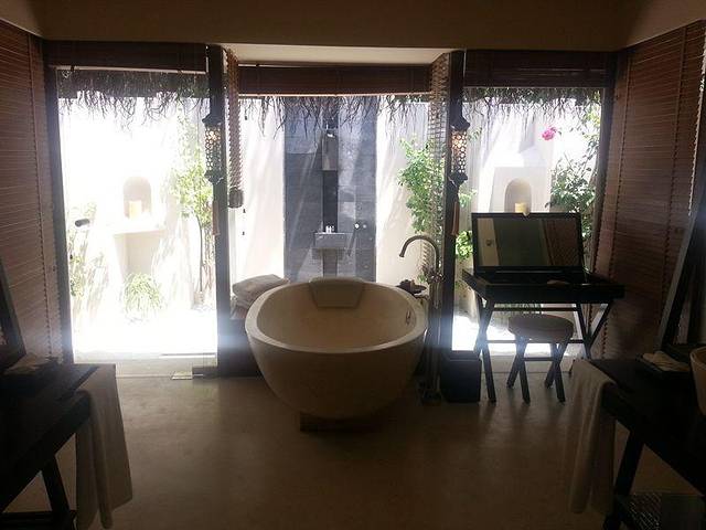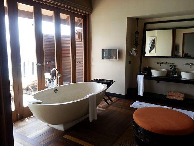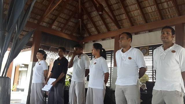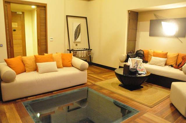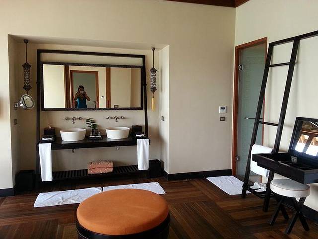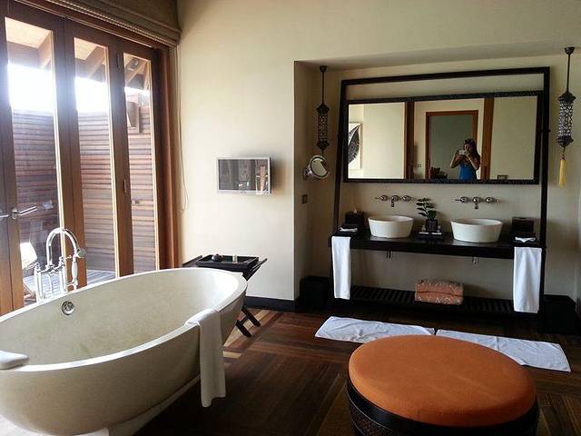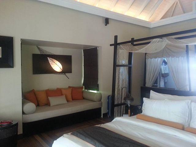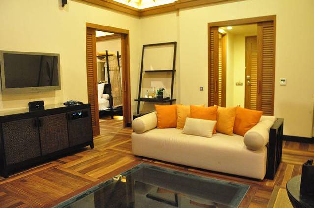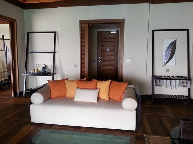 管家法亚就带我们两对游客,可能是我们都是从上海飞来的,又都是2沙2水,同一天退房所以把我们安排住一起了吧,邻居美眉说正好有个照应,呵呵~ 然后法亚把我们各自带进房间仔细做了讲解(后来给了他10美金小费),灯的开关啊,什么饮料免费什么收费啊~ 都一一说明,最关键的是问我们要了结婚证复印件,这样就可以帮我们安排蜜月套餐了,可以享受一次蜜月早餐送进房间的服务,还有一瓶香槟,一次烛光晚餐!如果是来度蜜月的亲可不要错过咯~