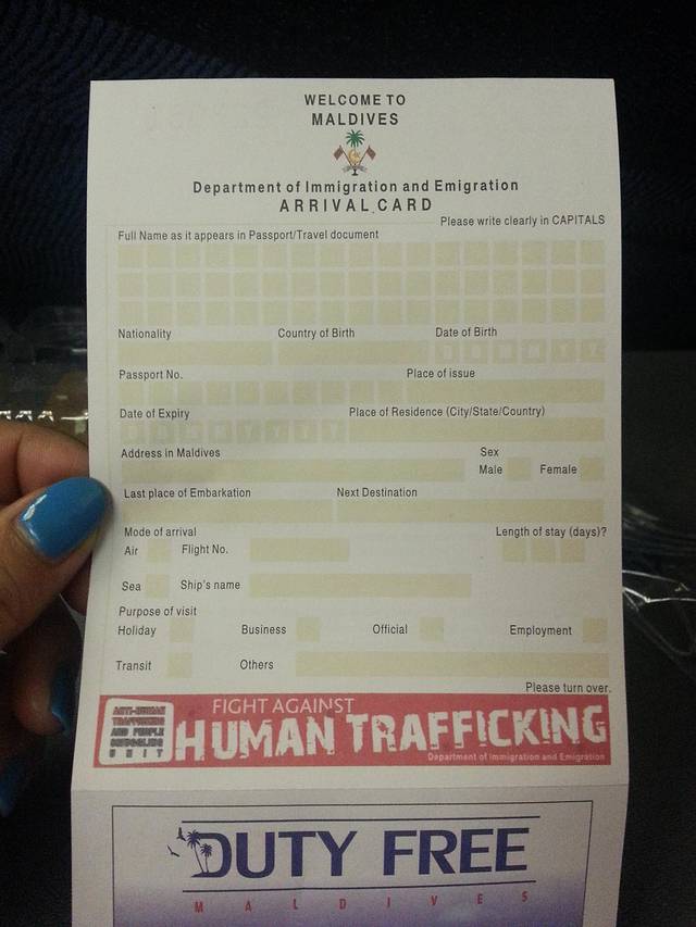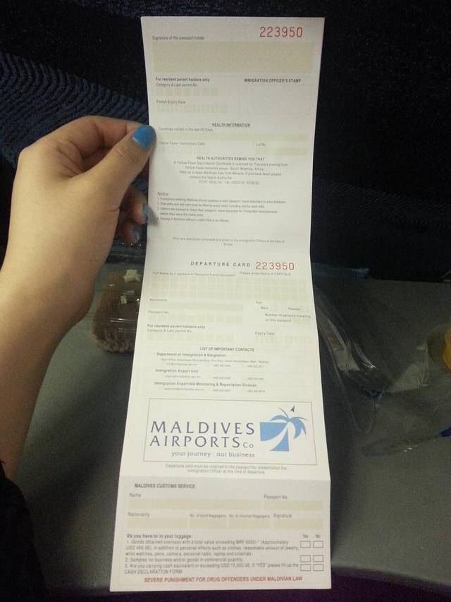 马尔代夫是免签证的,只要在飞机上填出入境单即可