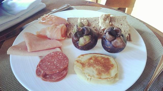 出门正好遇着法亚,我们说去吃午饭,他就开车顺带我们过去了,毕竟这两天我们都没怎么麻烦过他,不像别人水没了也要喊他送的,呵呵……法亚直接把我们带去了泳池酒吧,好吧,那就在这儿吃吧,不过这次点的还行,挺好吃了~