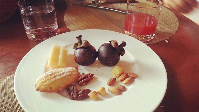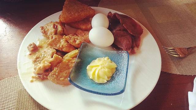 今早安排了蜜月早餐的送餐服务,这个是要提前一天预约的哦!差不多8:30给我们送来的,放在了院子里,小黑很有礼貌的脱鞋进屋,然后帮我们摆早餐,给了2美元小费,哇!好丰盛的一餐啊~~~太享受了吧!我去吃自助肯定不会拿那么多,吃不完还拿那么多会不好意思的,呵呵~
