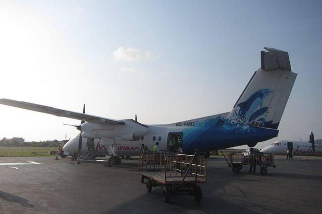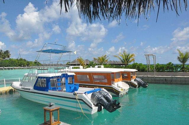 之后办理入境然后转内陆小飞机,7:40起飞~在空中俯瞰下面的岛好美啊~ 飞了一个多小时终于到了中转机场KaadedhdhooAirport,看到了Ayada岛的管家来接机,工作人员帮我们卸下行李搬上快艇,要一个小时才能到,最南端真的很远哦!