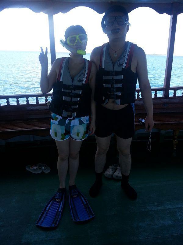 玛古吃个早饭回屋浮潜哟~结果忘记去浮潜中心借救生衣了,只能拿屋里提供的了,但是太大太笨重了,实在不方便啊,而且它不是马甲式的,是套头的然后后背全露,结果就更杯具了,背上全黑了……
