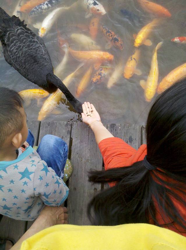 黑天鹅会吃你手上的饲料,不疼的,不用怕