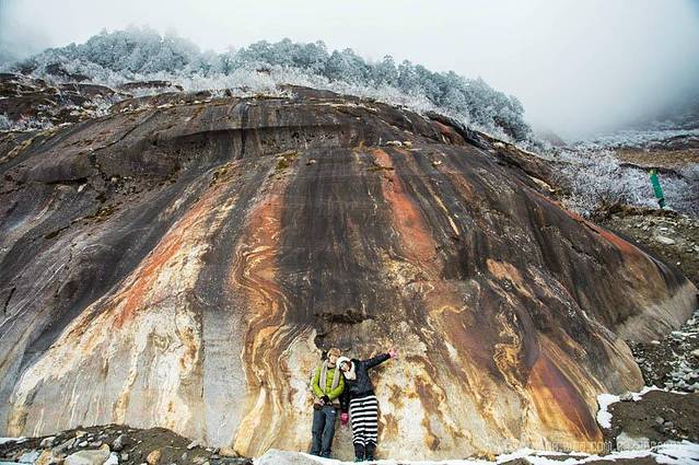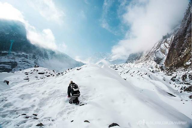 由于雾天关系,当地人说坐索道是看不到东西的,所以我们选择的是徒步走上海螺沟观景台,边走边拍,还可以下到冰川舌上将冰川踩在脚下,最最近距离的接触海螺沟千年冰川。