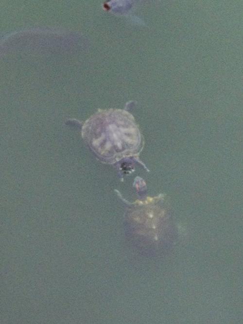 有池塘、里面很多放生的乌龟、鲤鱼。