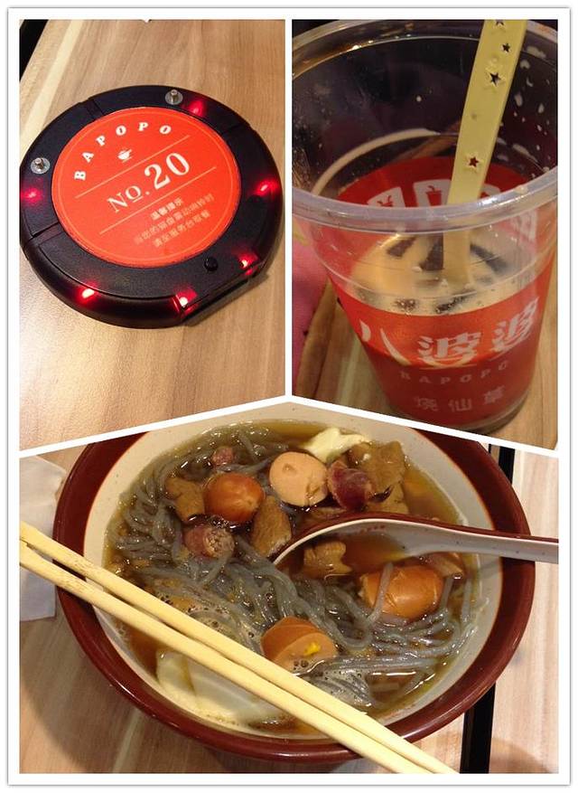超市同一楼面有不少小吃店。选了八婆婆,点了烧仙草和土豆粉。餐厅叫号服务很有意思欧。给你一个圆饼状的小盒子,响铃并震动时,就是通知去领美食啦。