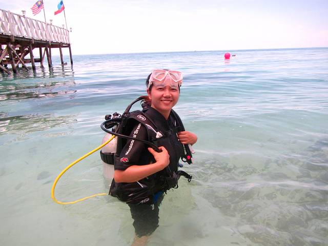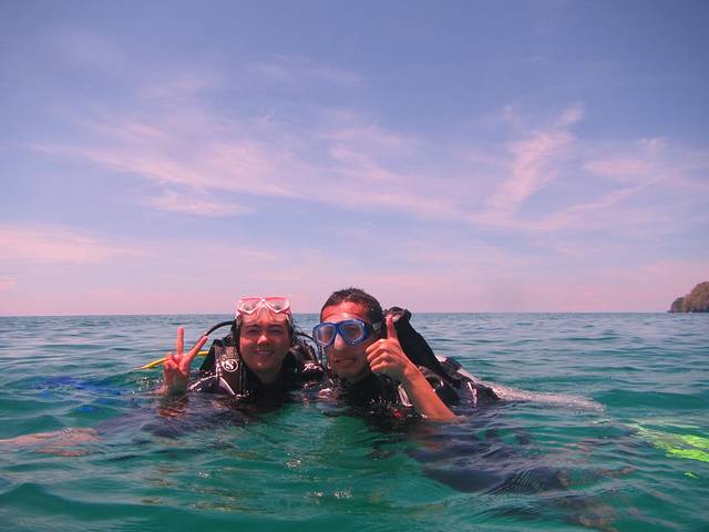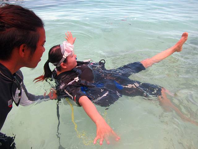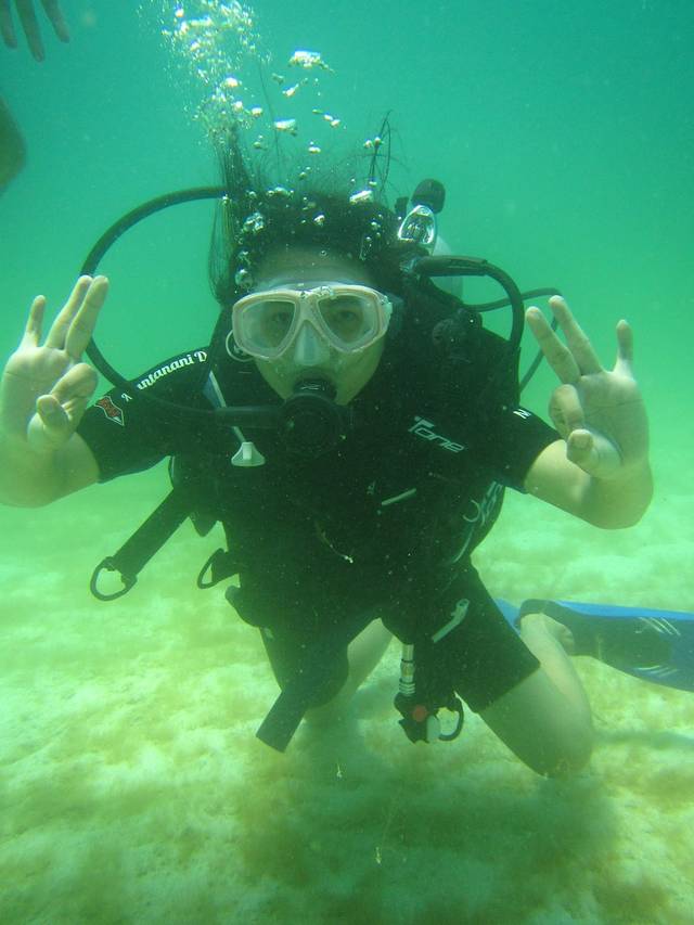 潜水教练说,你们有谁会游泳,有谁体验过潜水,我们回答一个体验过潜水但不会游泳,其余3个会游泳但是第一次深潜,教练顿时晕菜了,呵呵