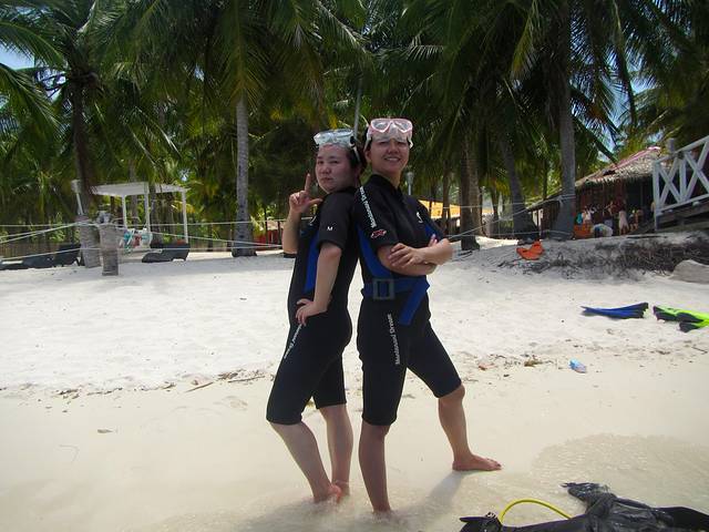 由于是去潜水,通过淘宝租了一台潜水相机,在租相机的淘宝店还顺便租了水母装和浮潜套装。事实证明我们的决定是明智的,美人鱼岛上是没有提供有度数的潜水镜的,还特别像我这种左右眼度数不一致的更麻烦,水母服还是能防一下阳光,毕竟浮潜是赤裸裸的烈日下暴晒啊。