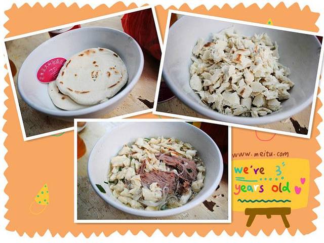后来又去吃了有名的老米家大雨泡馍,记得有大雨两个字,边上一家叫老米家泡馍,生意就差很多,别看这两个馍,有点硬的,掰完我手指头都红了。。而且越掰到后面越没耐心,这个馍要掰的黄豆大小才好