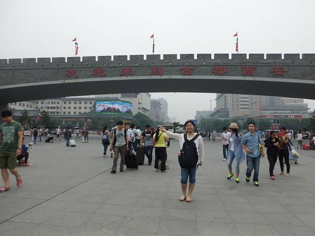 九点多火车到达了西安,一出火车站,就看了西安的古城门,真的很喜欢这种感觉,果然是古城西安。因为第二天要去华清池和兵马俑,所以就拖着行李箱事先看看游5的上车地点。看着火车站的左手边人特别多,而且也停靠着很多巴士(本人东西南北不分,就是一走出火车站的左手边)一看我们拖着行李箱,就有很多人前来搭讪,问我们是不是去华清池和兵马俑。刚到那里,我发现很多巴士都号称是游5,大家要认清游5是绿色的,而且有条很长的队伍,有专门的人员在售票,不懂的话问问排队那些人是不是在等游5。准备前往网上订好的旅舍,看到火车站对面就有公交站牌,而且恰好也有在南门停靠的公交,所以我们就糊里糊涂的上车了。悲催地是公交车在南门外下车了,我们托着行李箱问路,幸好西安的天气不热,太阳不大,一番曲折后终于找到了湘子门青年旅舍。
