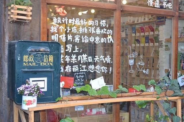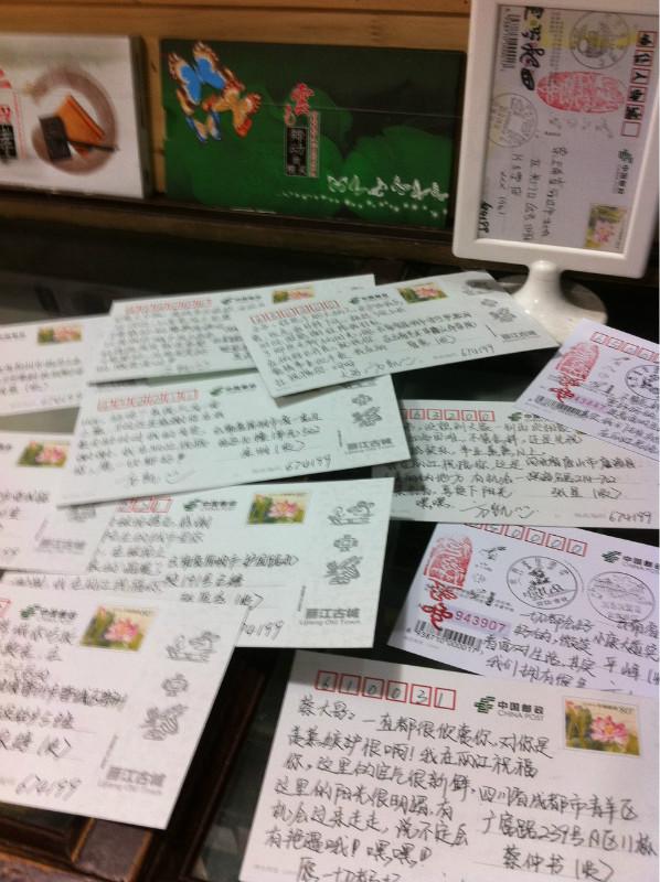 旅行时挺喜欢这种卖明信片的地方,可能是因为朋友不在身边的原因吧,从小到大的环境就是湖北。大部分同学也是那里,好点的同学和朋友又天各一方,考虑到现实的实际因素,不可能像小时候那么随心所欲的想怎样就怎样,大家的生活圈子不一样了,为了寻求美好,我还试图去用明信片连接大家,传递一些旅行的心情和情感。07年的时候去桂林阳朔,当时给不少朋友寄了明信片,中途因为一些原因又放弃了,今年我又捡起来了,因为忽然明白了生命很脆弱,我们要学会珍惜,爱身边的人。写的多好,某年某月某日天气晴,我在丽江想念你!