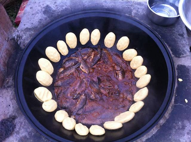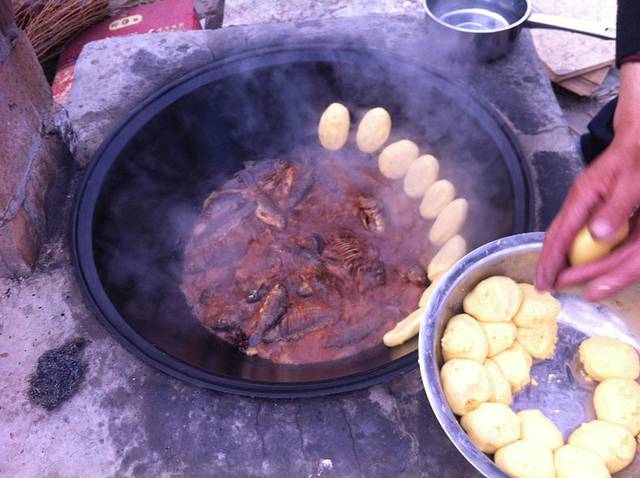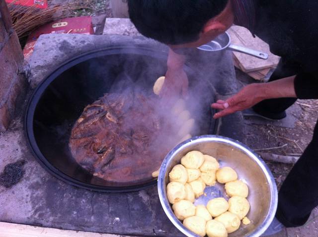 12点左右老板叫我们吃饭,有鱼有虾贴饼子,还有当地的野菜,很是丰盛插入图片(陈贺良老板在外面炖鱼)