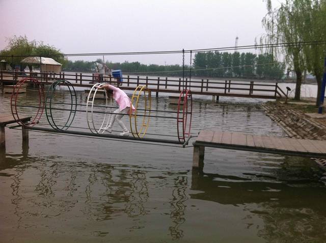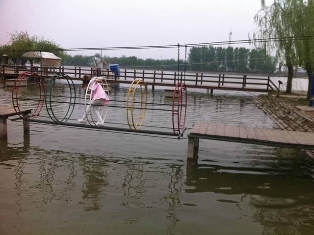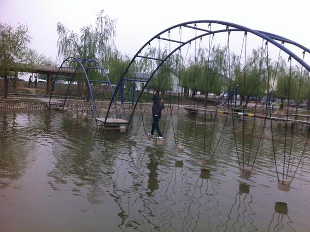 各式各样的桥,有的紧贴水面,走到中间就有可能进入水中,阳阳说体验的就是这份惊险,不过好像是这里面的水,不是很深,就是娱乐的。夏天天气炎热带孩子在这里游玩儿一下,真的是不错的选择,大观园建设是真的很不错