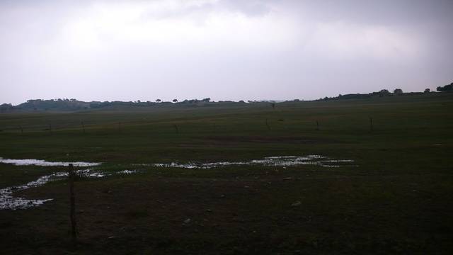 而天色逐渐阴郁了起来,继而开始瓢泼,远处开始电闪雷鸣,可以清晰的看见左前方闪电在不断击打远方山丘(而旷野之中那个山丘也不必身旁的高许多。。。),而雷鸣如炸裂一般发泄了许久的能量仍丝毫不停歇。