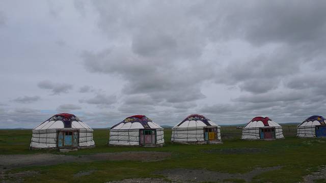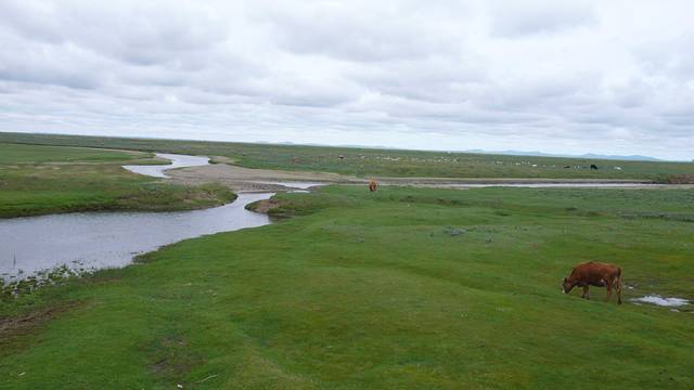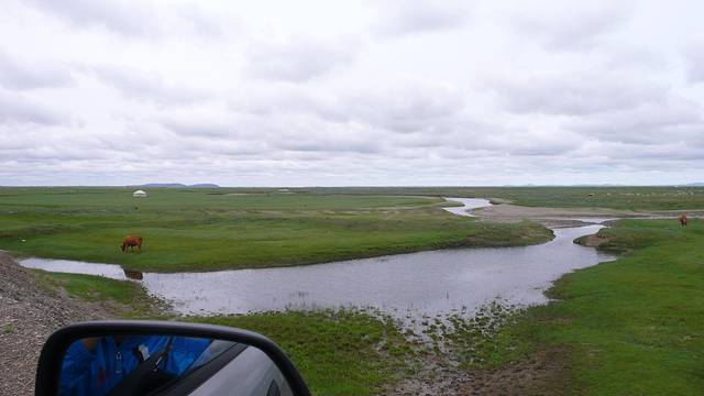 回到了贡格尔草原,每人花了一百多骑马(虽然几位蒙古汉子教过之后,就是自己一手牵缰绳了,但是马还是跟着队伍走,不让离队跑起来,否则还是危险),跟着前面已经出发的队大概不到十个游客,四五个骑手。唯一好玩的是,我们遛马的路线还算长,而且过了公路之后,还淌过了一条大概不到十米宽的河水(虽然马很高,但是水能够没过人的脚,必须伸腿才能不湿,而马毕竟身子几乎都没了一半,人手必须提着缰绳不让它害怕,也不让它喝水),真到那时候还是非常紧张的,毕竟钱包什么的都在口袋里掉河里就找不到了,何况人都没准落水。完全没有了刘备跃马过檀溪的想法。