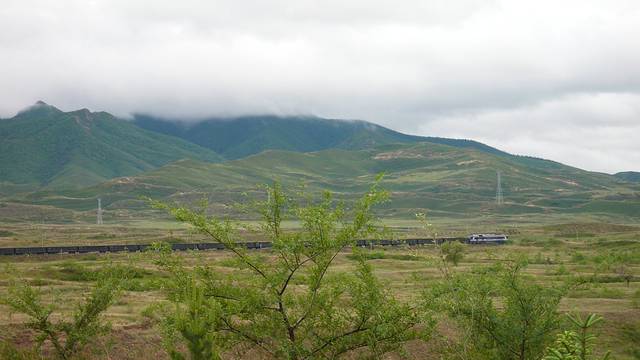 可见远处可能是货运列车从充满矿山的这赤峰西部穿过