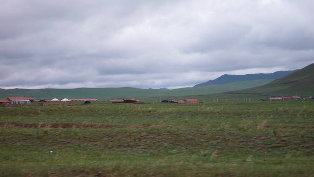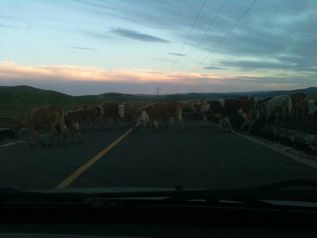 一开始那段完全是山群草海深处,原生态的蒙族牧民的驻地。一处处只有一两个蒙古包,每家周围都有着一两个羊栅栏——每个密集的圈着简直不能动换的上百只羊。周边是牛群。正值晚上,每个包都升起了炊烟~~