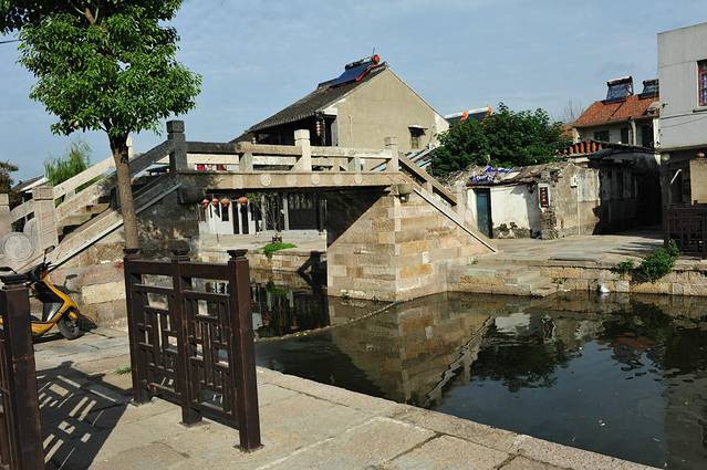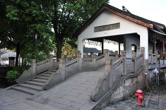 此桥最早建于明万历九年,几次修缮。相传以前晴天时站在桥顶上可以眺望到太湖边的青山。这里有幅对联:船从碧玉环中过,人步彩虹带上行,描写了过桥的两种方式。这是从长廊去往石皮弄的必经之桥。这是从长廊对面拍摄。