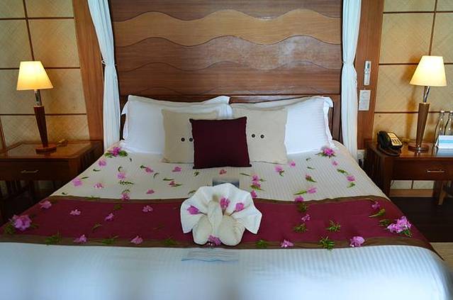 开buggy的小黑会送所有的游客去他们的房间,然后护送进去,嘻嘻,不要吝啬你的小费!然后行李也是,每件1刀。酒店赠送了我们蜜月大床,可惜只有一次,要是换房型会不会再装扮一次呢?