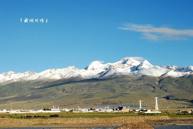 西藏的景色就是如此神奇,下面是一片无垠的草地,上面却是皑皑白雪。
