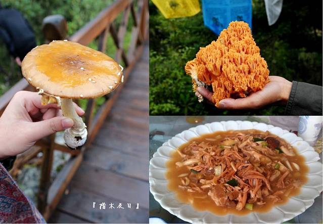措木及日野生菌,右边是导游为我们采摘的扫把菇,中午加工了下成菜,味道极其鲜美。