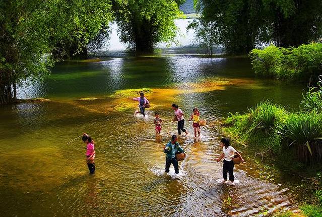 闲暇时相约几亲朋好友一起下河捞鱼,抓螃蟹把吧。