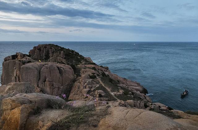 东漄绝壁在嵊山岛,去顶上的石子小路非常蜿蜒,我们打着小电筒摸黑前进。走了差不多20分钟,就看到东漄绝壁壮观的景色,很遗憾,今天的云层太厚,没有看到完整的日出。(东涯绝壁的风光真的很大气,因为停留的时间不长,天色偏暗,没能多按几张快门。)