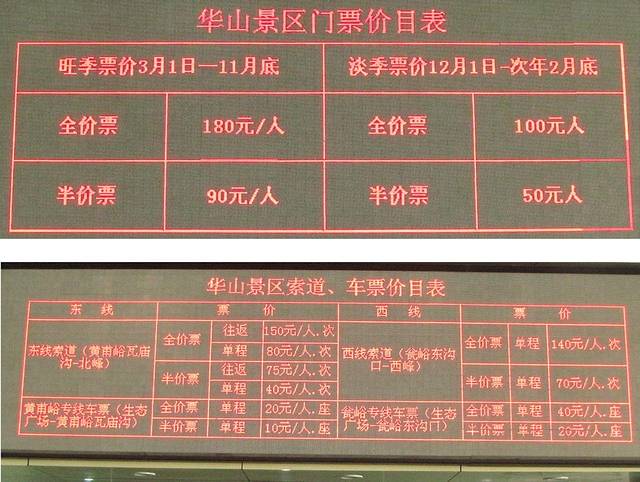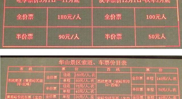 华山各种票的价格:(西上北下,每人需要5张票,门票+进山车票+西峰索道+北峰索道+出山车票)