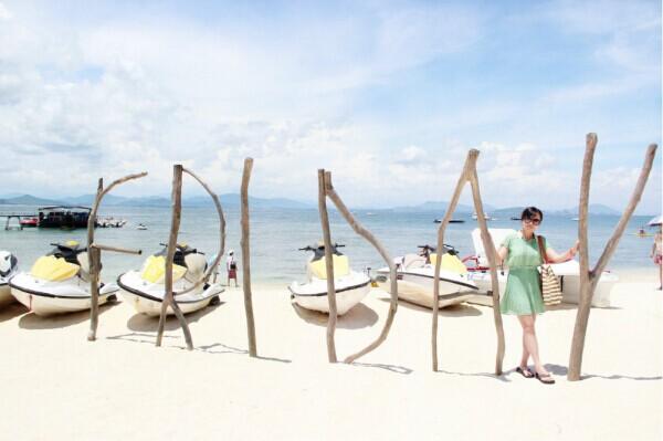 话说,三亚的太阳真毒,一会儿就晒黑了,小伙伴们一定要提前注意好防晒,带上墨镜,太阳帽,防晒衫等。在森林公园很多人走我身后的吊桥,以前是不要收费的,现在是20/人,就是因为舒淇在上面走一走,这桥升值了,……这明星效应!!!疯啊!!!火啊!!!亚龙湾海滩的时候有几个娱乐项目,在这里,要推荐一下拖伞,潜水。很刺激!!!每天楼主都是汗流浃背,好不容易化点妆留影一张,过了几分钟就花了,原因你们懂得!!!!!天天都是汗洗澡啊!!!!!