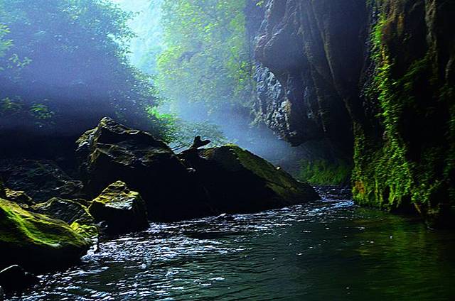 但如果说“幽、秀”是这里的特点,我是不敢恭同的,因为那种大片大片的野性姿意的绿,那种勃勃张扬动感十足的绿,让你无法把它和任何“幽、秀”联扯在一起。仰卧在艇上,我甚至不敢与那两岸仿佛高耸连天的绿对视,那种那么绿的绿,让我心生悚然。