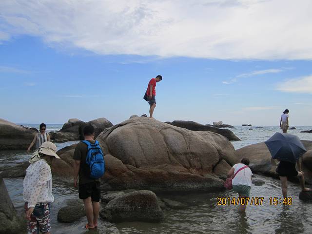 三亚晒晒的太阳,于是我们懒懒的歇到3点才出门去天涯海角,其实我也知道这个老景区没什么好玩的,不过来了三亚,还是去趟天涯海角吧。穿长裙就不能尽情享受海浪拍打啦,海边就应该是短裤,我穿长裙是一路拎着走的。天涯海角不要坐船,可以走走沙滩,年轻人一路玩玩水就能走到著名海角石啦。这里的海域都是大礁石,沙滩有碎贝壳,有点割角,但是走沙滩一定要光脚,穿沙滩鞋也会进沙子磨脚的。