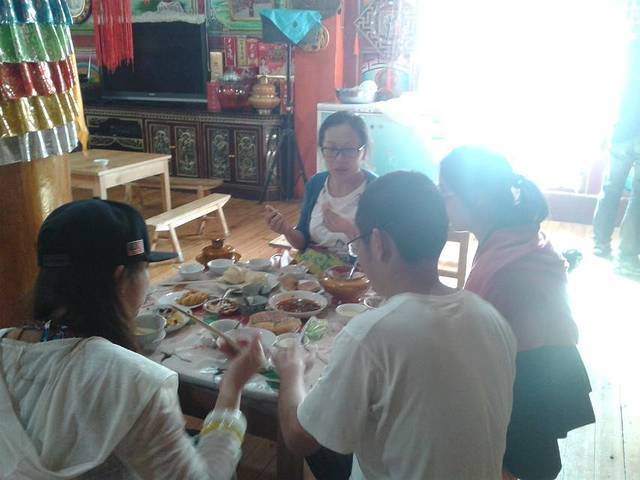暂别了颂赞林寺,徒步来到了藏民家做家访。牦牛酸奶,青稞饼,酥油茶,还有不知名的小吃。让身为吃货的我,此刻再也淡定不了了。美景美食,实乃人生两大乐事,享受当下,在此刻显得最为恰当与真诚。在门缝底下透出的一束光线,将细碎的灰尘照耀的无比亮人,空气凝结的那一刻,我们笑了,美如夏夜。古朴的藏家建筑风格,冲击着自己以往对万事万物的视觉体验,它像个无声的导游般诠释着最原始的一切。