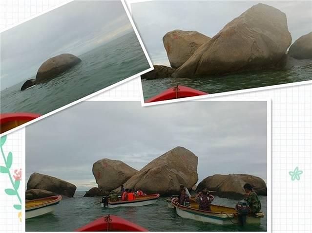 第二天,我们自己去的天涯海角,正好大东海那边有个公交车站,好像是几块钱的车费。我们坐的中巴车,售票员是东北人给我们介绍了天涯海角。主要有两天路线,一条是走路自行,一条路是坐船在海中间看。听老板的意思是坐船比较好玩。我们最后选择了坐船,门票是120,我们有学生证就100块了。拿着门票会有船夫在那里,直接给他票就可以了。听说在海上不走原路,所以一个景区去了就照相就走,船夫会给你照相。我们大概在海中间游了20分钟,快结束了。船夫说,有门票没包含的地方,出50块钱一个人就带我们去,好像是海上观音什么的。我们没兴趣就没去了。