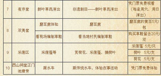 在这里,“爸爸去哪儿”节目中星爸与萌娃执行的所有任务,游客都能体验到。比如穿汉服和明星合影、乡村独轮车比赛、在被姚明称为“最乡村的篮球架”上投篮、品明星爸爸们最爱的农家土酒、有序堂戏台学唱昆曲、南塘划农家脚桶水中取物、磨豆腐、赏荷、采莲蓬等。游览结束后在新叶古村农家体验深受星爸萌娃喜爱的农家菜肴。