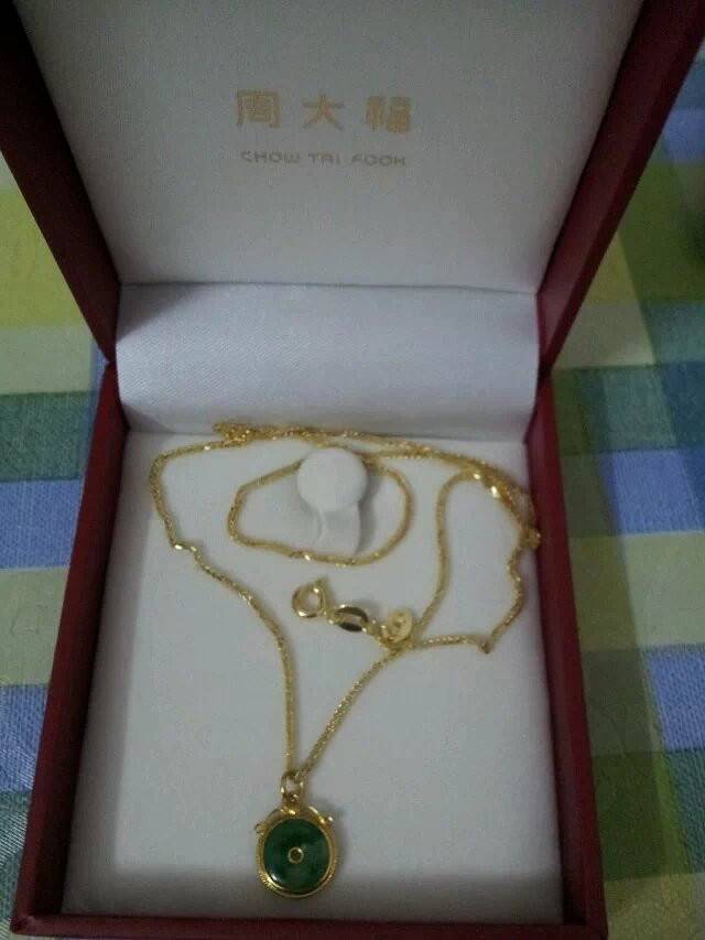 这是在尖沙咀的周大福买的,只是一条裸链,玉坠是我自己原来就有的,为了这个玉坠特地买的K金项链,结果被我妈咪P了一顿,说我为什么不买黄金——好伤心,这个标价1200港币,还帮妹妹买了对耳钉,周大福两件打95折,三件88折,买了两件所以95折,应该比内地便宜吧,少了税点