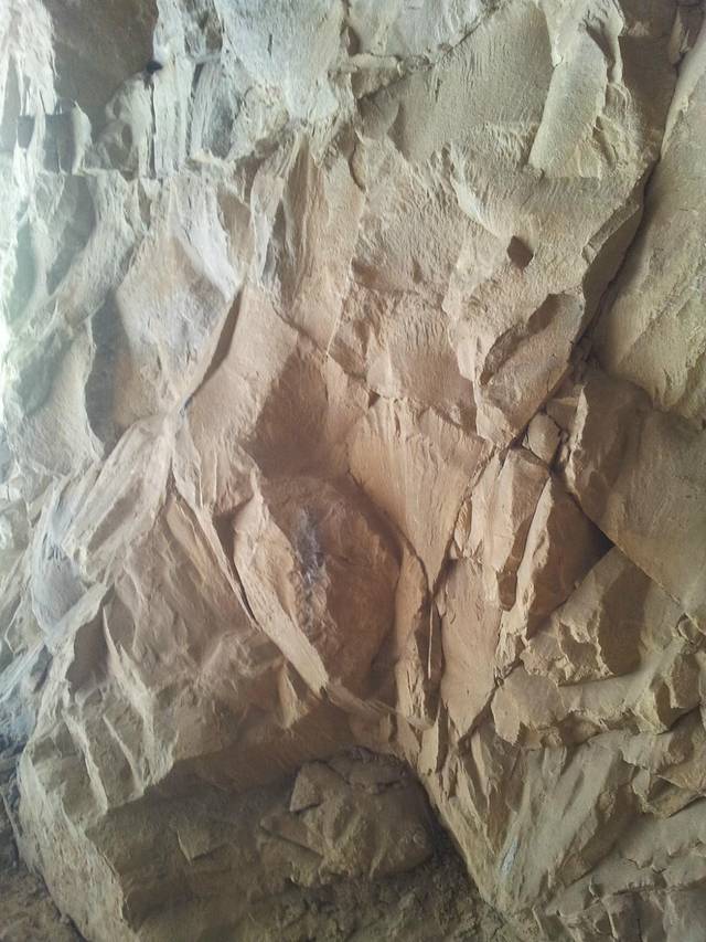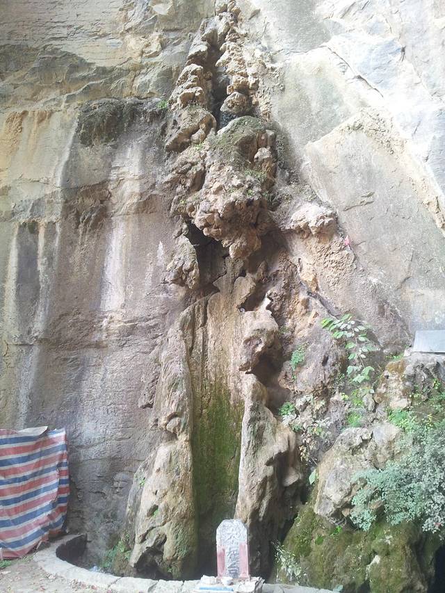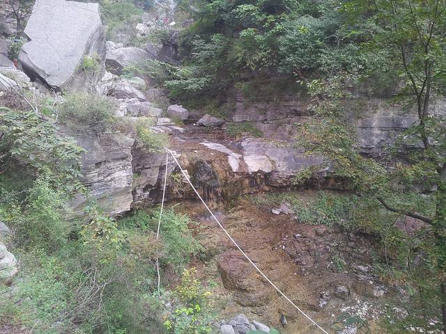 在九莲山那里,也有一个天梯,两边都是栏杆,这个天梯却要比他恐怖多了,从远处看,只是几根细线挂在悬崖峭壁上,差点让我萌生了从来时路穿回去的想法。还好走近了才觉得不算太险,虽然还是在悬崖边上挂着,不过台阶一米多宽,脚下的碎石也不是很多,走上去还算安全。下了天梯,继续往前走就到了老龙口的正下方。这里能看到向前探出头的老龙口,下面渗出的地下水味道还不错,可以补充一下补给,之后的路也不算难走,路过的地方,很多石头都特别好看,只是没有实力搬一块回去。