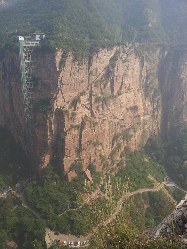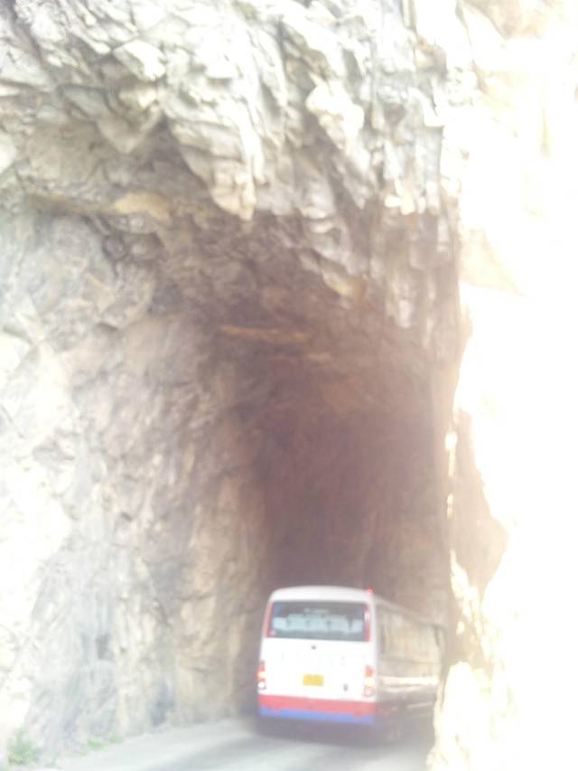 出了景区已经晚于规定的时间了,看到乐队时,前面的队伍已经走了十几分钟了,前面是七公里的挂壁公路,曲折环绕这一路延伸到锡崖村。挂壁公路是我见过的最陡的公路了,感觉如果是雨雪天气,就根本不能开放,从上往下看,如一条长蛇穿岩过洞,秀气而飘渺,从下向上看,巍峨耸立的大山中透出几扇石窗,却足以将人类征服自然的决心印刻的方方正正。