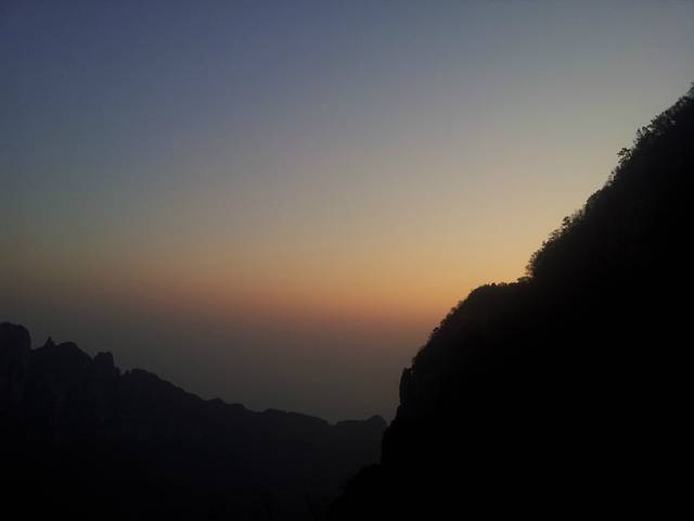 等到队伍行进到半山腰的时候,东方的鱼肚白已经代替了头灯的亮度,日出马上就要开始了。想想自己曾经错过的几次日出美景,一咬牙,开始小跑超车,这下用力过猛,小腿肚子感觉到有些疼。但是快要到山门的时候,却看到前队的几个队友已经站在平台上拍照片了,晚来了半个小时左右,又一次跟山顶的日出擦肩而过。至于说云海,因为河南这几天没有跟北方一起大幅度降温,也留下了不小的遗憾。