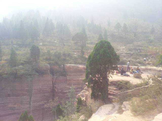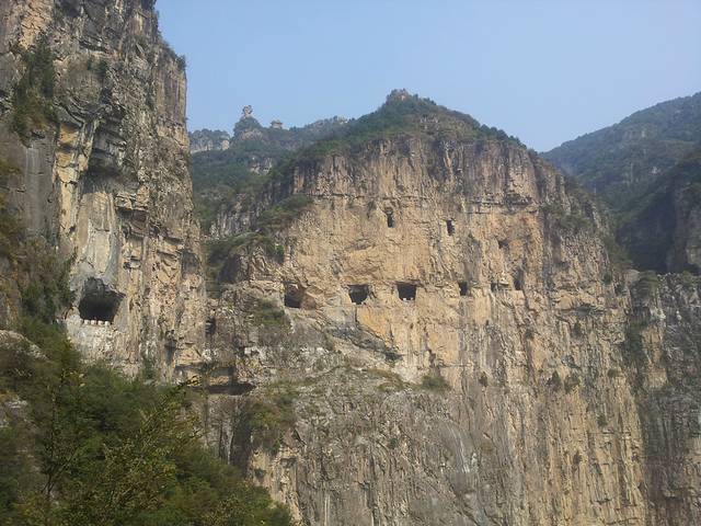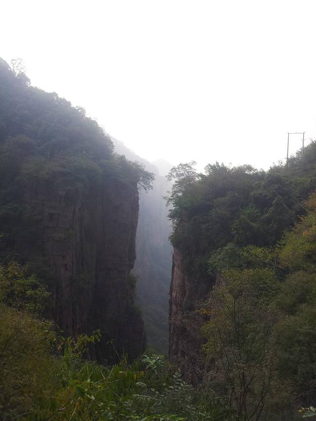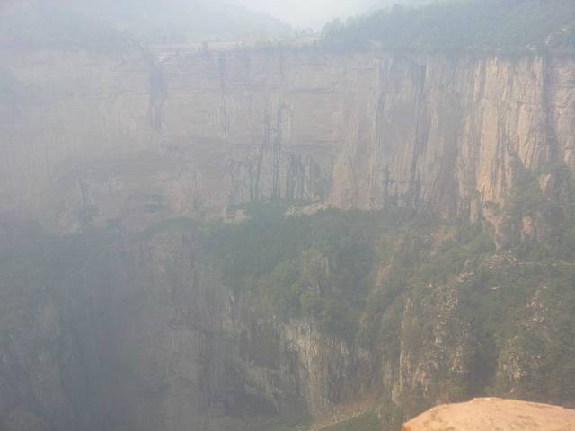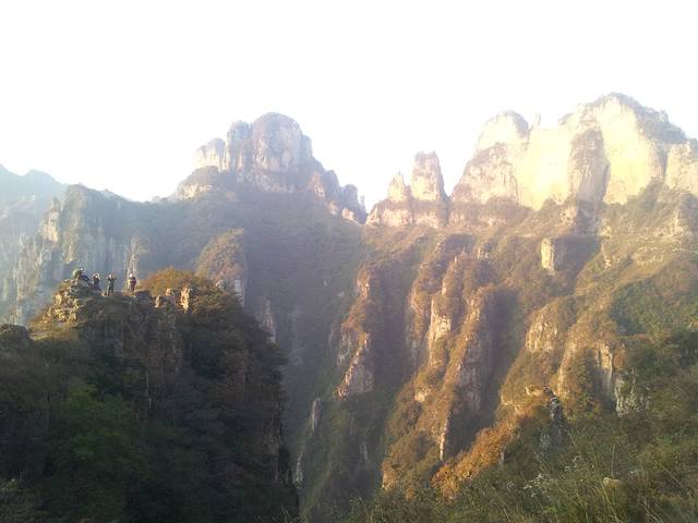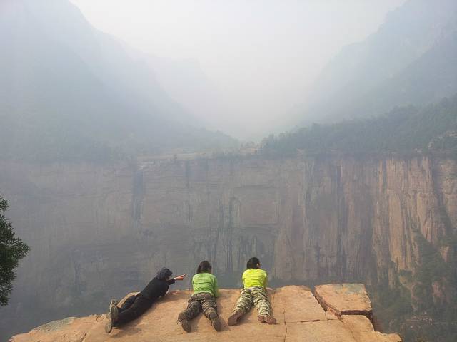 转过山门穿过崖口,前面就到了第二个集合地,好几个人都已经走到崖前的一个平台上,通往平台的路两边没有什么可以扶的东西,从远处看,这条路也就只有一米多宽,走到跟前的时候,两腿发软,最后也没有勇气站在平台上,只好选择另外的悬崖,颤颤巍巍走过去,拍了张照片。