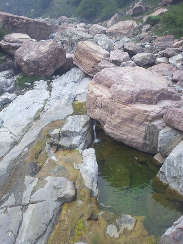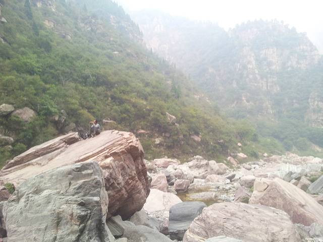 老龙口是一个瀑布,若是水大,可以看到水从龙口的地方喷涌而出,可惜我们来的不太是时候,河里的水似乎都被调到天河瀑布一边了。不过这里的一片大石头还是蛮有趣的。走到这里的时候我已经累得筋疲力尽了,正好在这里休息,于是支开吊床躺会。跟大家拍了合影之后,就走天梯下山了。
