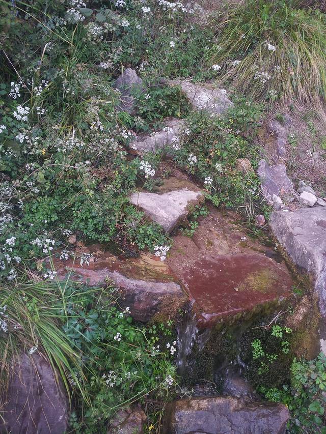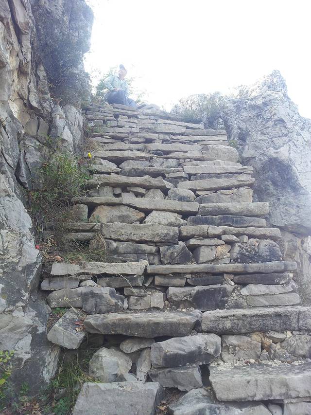 接下来是猫路。据说猫路近期也被新拓宽了一点,但就我看来,比前一天走的天梯要可怕的多。大部分台阶都是拿小石头拼起来的,坡度陡,而且路的前面就是悬崖。从上往下走的时候,我已经害怕的顾不得面子了,扒着墙头一点点的往下挪,下到一个平台上,远远的拍了一张照片就往回返了。队伍中,可能我是最明白猫路的来历了,因为只有我一个人,像猫一样扒着台阶,像猫一样弓着背向上,好不容易回到了队伍集合点,又是一身臭汗。