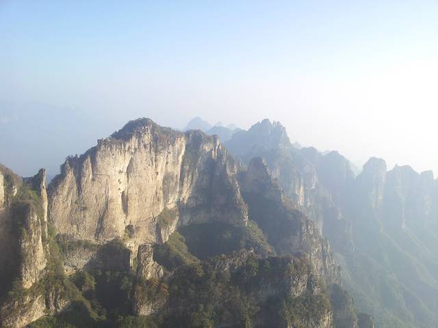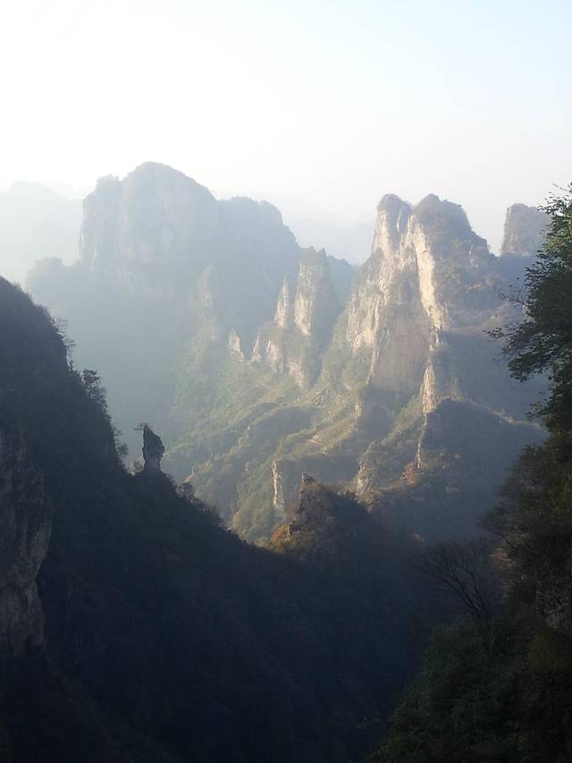 景区里的石板路顿时有一种脚踏实地的安全,王莽岭传说是王莽追刘秀的地方,景区里的观日台、散花台、抚琴台、勒马岭都是观景的地方,为了克服自己的恐惧,在散花台前,我几次三番的鼓起勇气,靠近悬崖边刷新了本人距离悬崖最近的人生记录,大约半米宽左右,把手伸出去拍了张照片,然后晃晃悠悠的返回。一直想看看刘秀跳的地方,可是在景区绕了一个大圈,还是没有找到,因为没有门票,也没有勇气去找景区的工作人员去问,后来又去了抚琴台,遇到几个从台湾来的旅客,互相帮忙拍了几张照片,最后和另外一个哥们一起出景区。