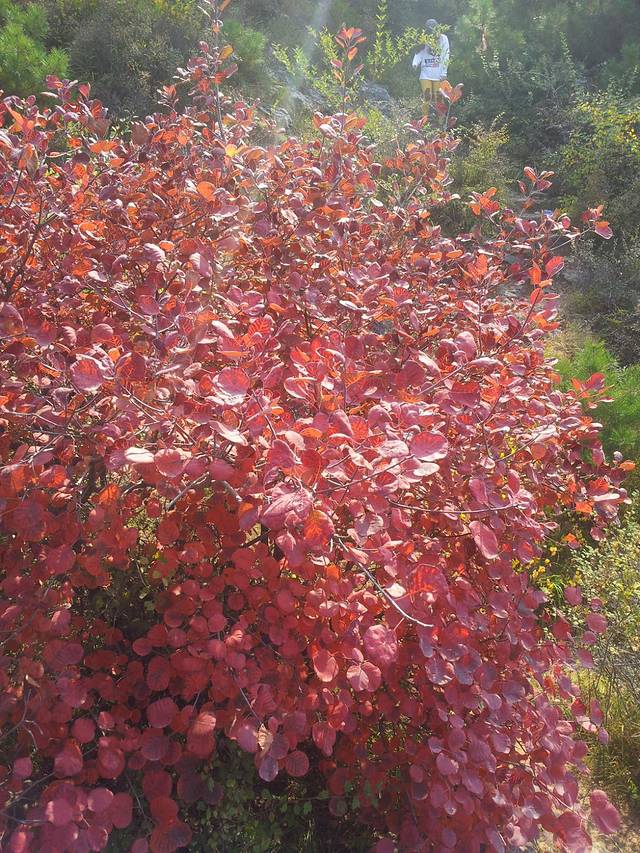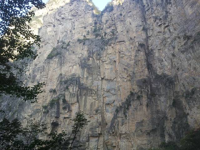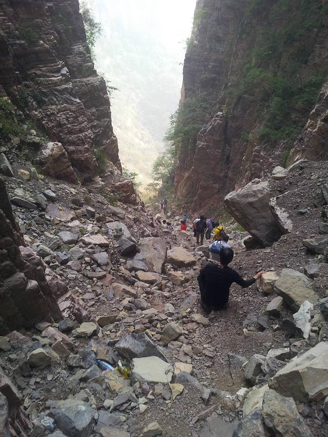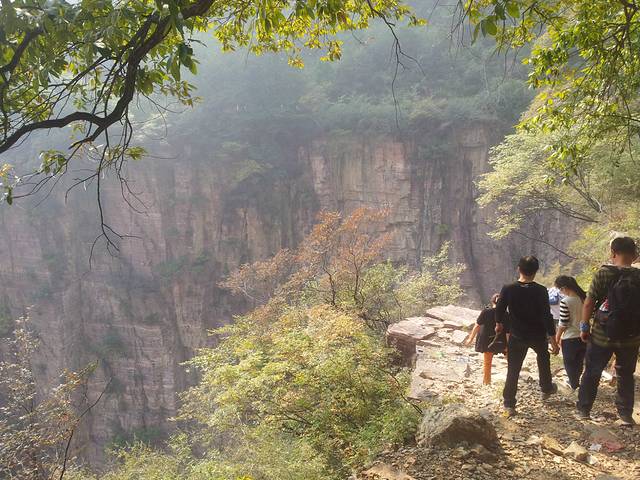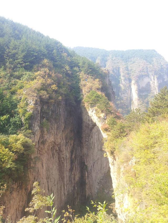 早饭带了一个馒头,不过景区里的鸡蛋饼明显更对我的胃口,买了四个鸡蛋饼之后,开始向老龙口的穿越。这一段路可能是我人生中走过的最让人害怕的路了,从小在延安也蹿高纵矮,但是,黄土高原的悬崖最后也就十来米,从来没有听说过有人从山上掉下来摔死的情况,今天这路,左边是厚重的大山和黄土,右边则是垂直而立的悬崖峭壁,从远处看,感叹大自然鬼斧神工,把个南太行雕琢的壮丽雄伟又不失青山绿水,可走在这悬崖峭壁边儿上,又觉得腿肚子转筋肝儿打颤。一路上,略微有些恐高的我不停的跟自己说,你从小到大走了几千万甚至几亿步了,从来没有摔倒过,这点路根本不算什么。同行的另外一位大姐也在鼓励我,从心理学的角度教导我,就这样我一边聊着天,一边哆哆嗦嗦,来到了老龙口对面的大石头上。