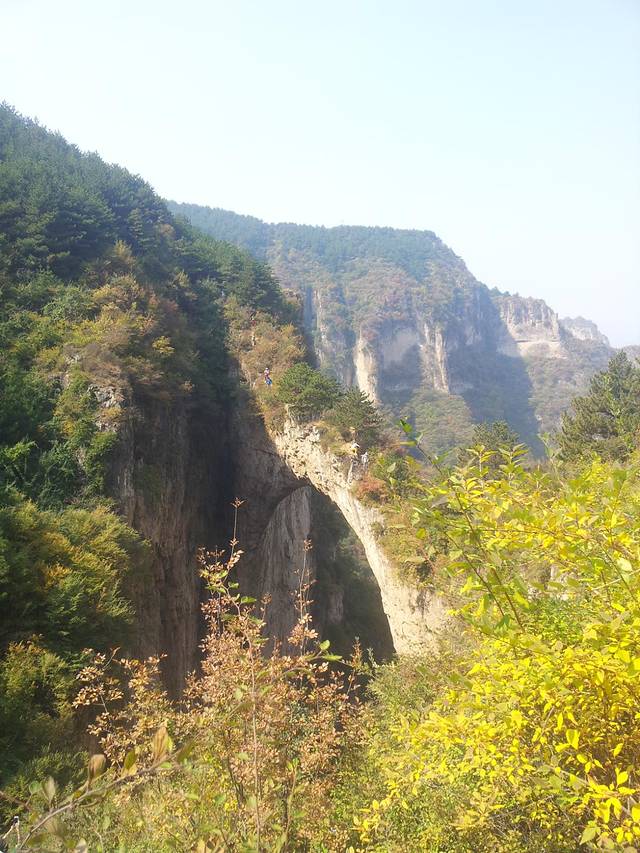 从侧面看天生桥的感觉跟走在上面是不同的,过了桥之后,我已经感觉到自己的脸色刷白,从侧面看,桥上的人只是一个小点,有过了身临其境的感觉,觉得这点困难还算是可以克服的。但是等我拍完照片,要从天生桥回去的时候,那种对高度的畏惧又来了。好在回去的路上坡比较多,我开始什么都不想,冲过天生桥,然后拽着树枝和石头,一路往回冲,直到过了松树林,才觉得安全多了,然后找个树荫歇歇脚,回去把午餐吃了。