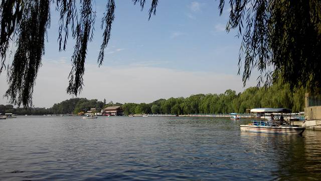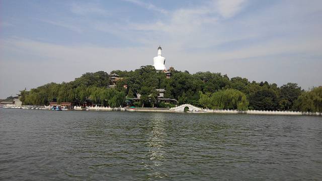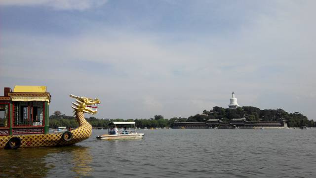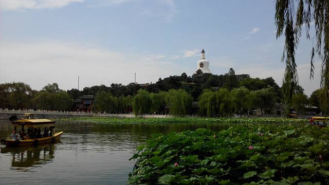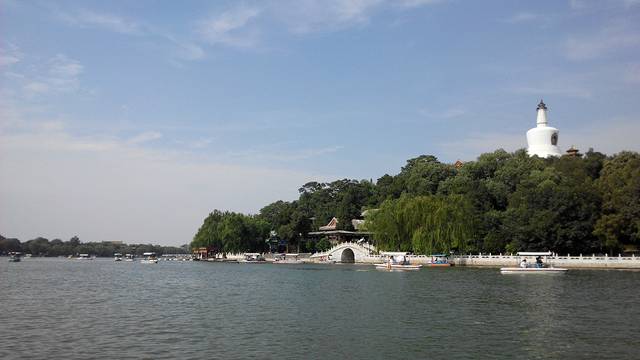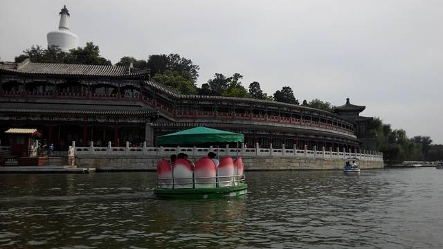 一边唱着”让我们漾起双桨,让我们推天波浪...”,一边赏白塔,只是我们坐的是电动船,没有桨。
