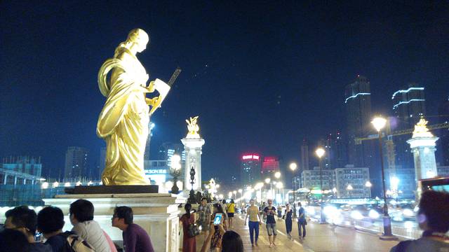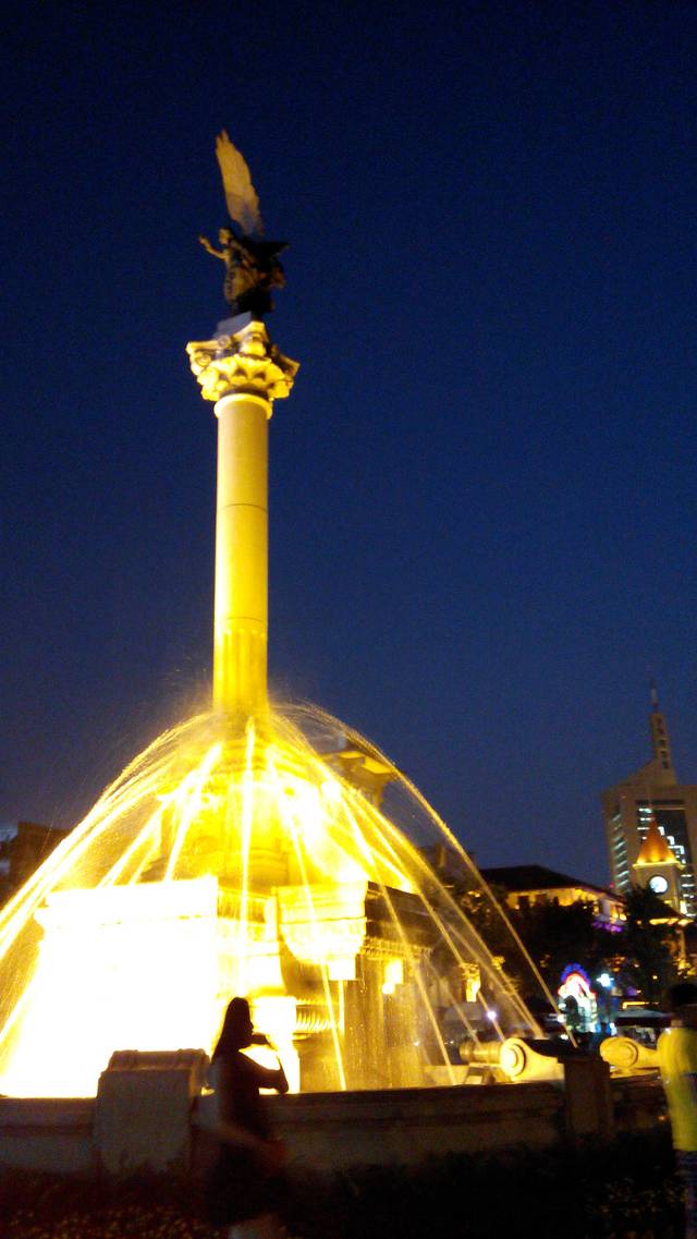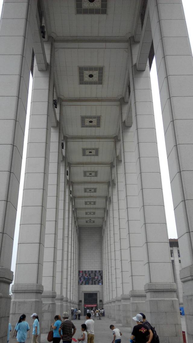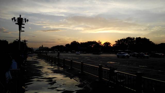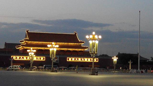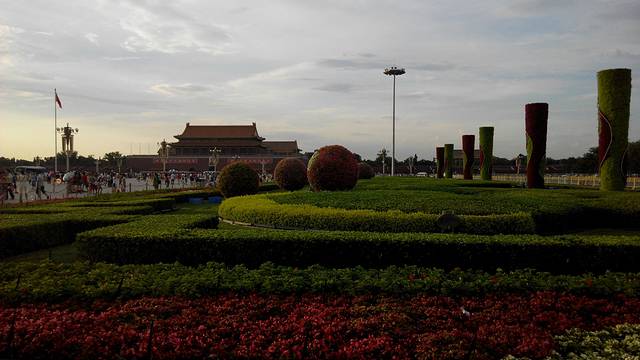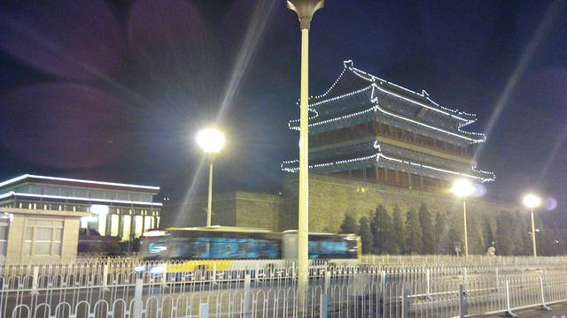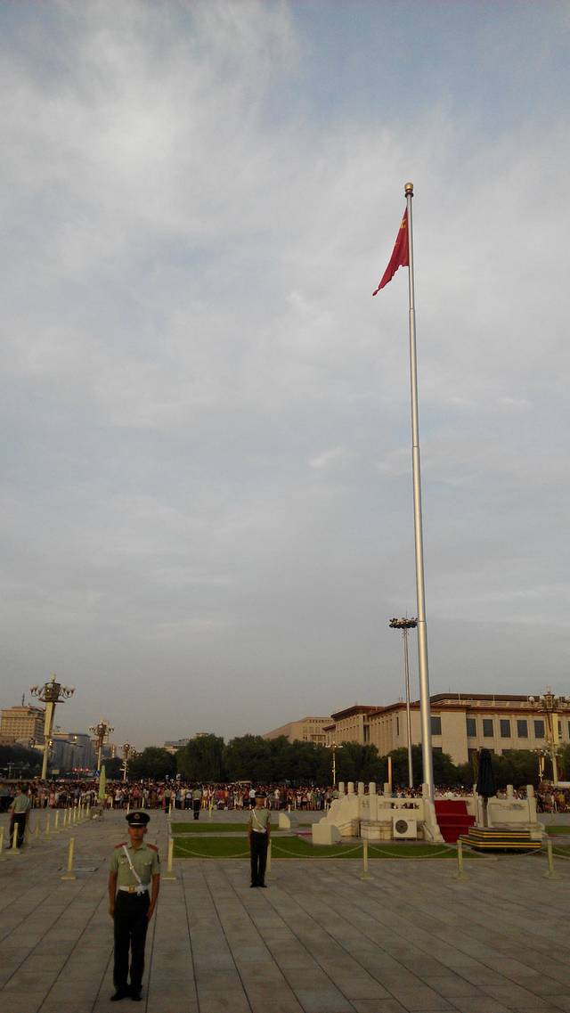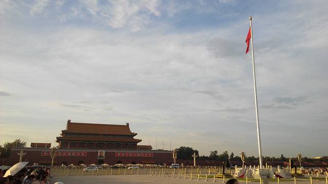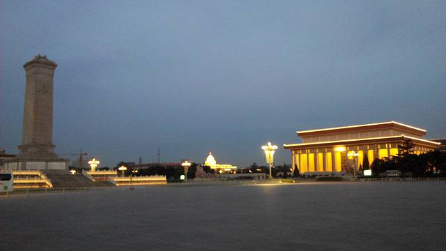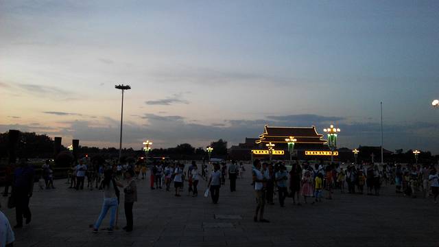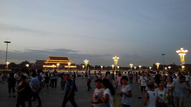 吃完北京烤鸭后出来坐地铁2号线到前门站下车步行到天安门广场,每天降旗时间不同,上网可查,当天是19:47降旗。降旗后马上清场,没能好好拍一下夜景。