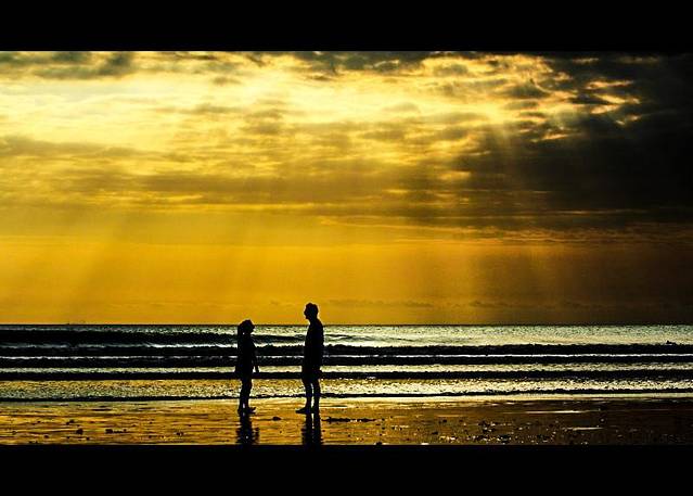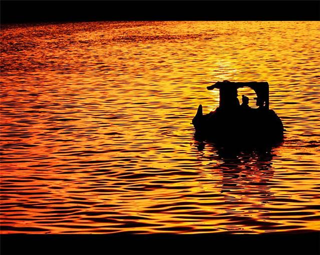 【日落之下,海边被染成一片金色,当地的居民在这里享受着惬意的时光】