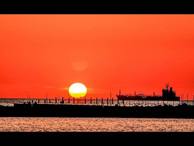【一轮圆日,伴着忙碌的港口西下】