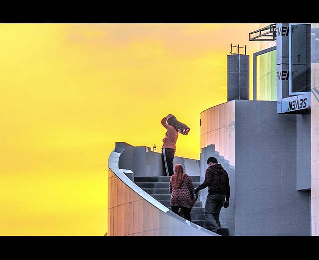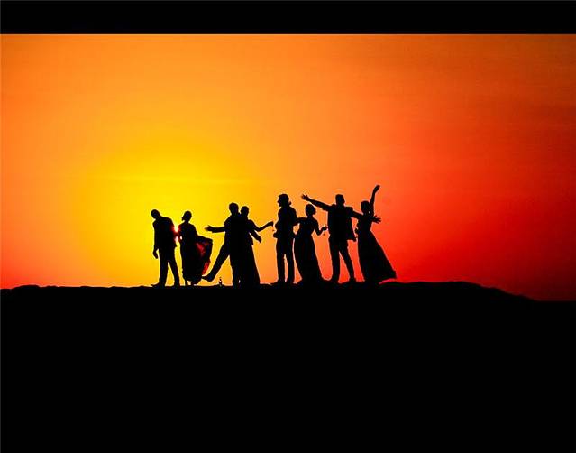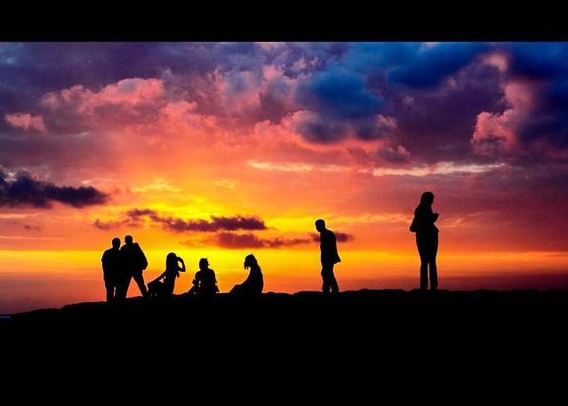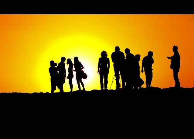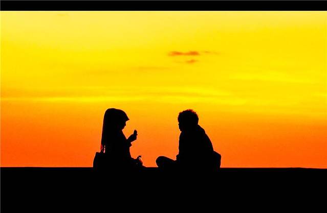 【耀眼的晚霞中,人们畅所欲言】